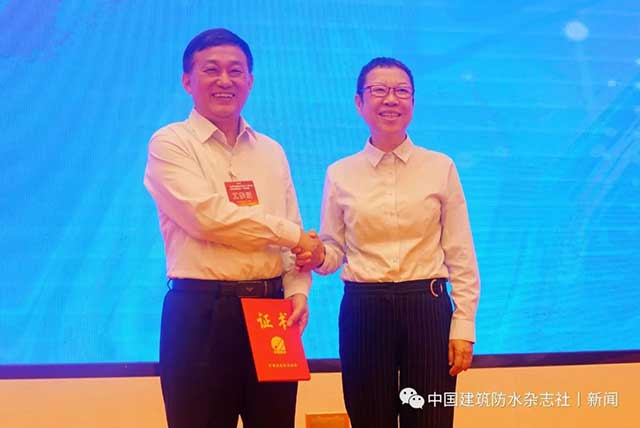 中國建筑防水協會常務駐會副會長苗燕向胡希寶頒發瓦屋面分會副秘書長證書。